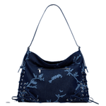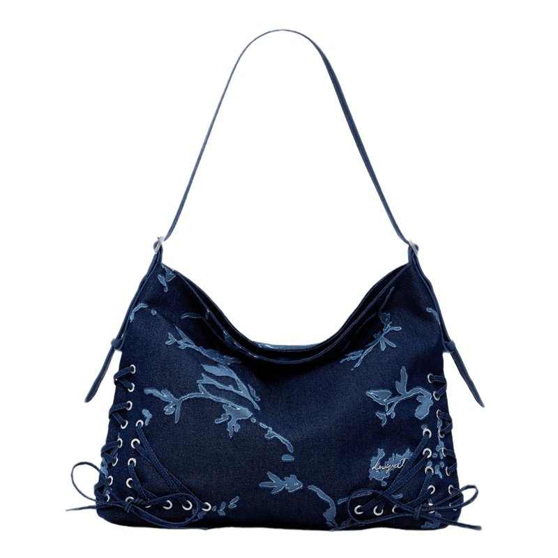 Bolso bandolera de tamaño mediano, tejido efecto devoré, asas ajustables en tejido efecto piel y cierre de cremallera.
