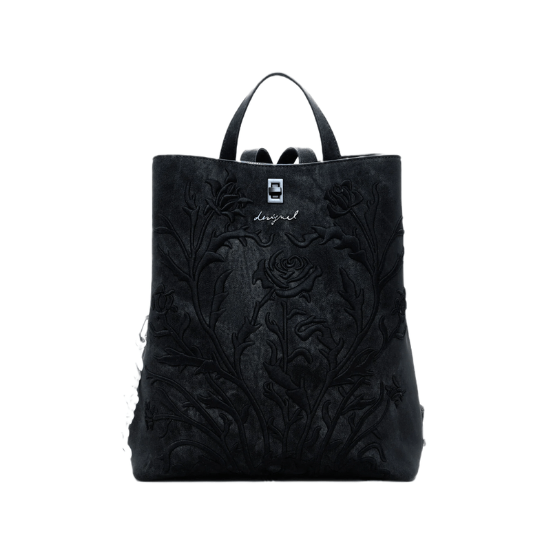 Mochila pequeña de piel sintética con flores en relieve efecto 3D, bolsillo exterior trasero y varios compartimentos interiores.
