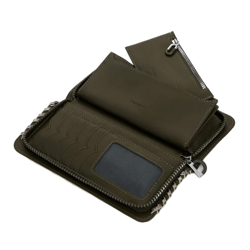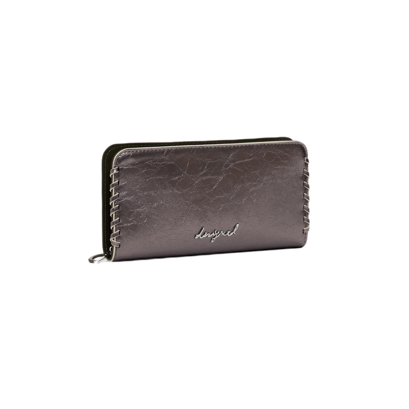 Billetera grande de cuero sintético con costuras laterales, cierre con cremallera, múltiples ranuras para tarjetas y logo metálico grabado. Elegante, práctica y pensada para el uso diario.