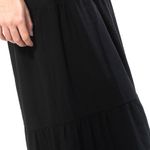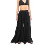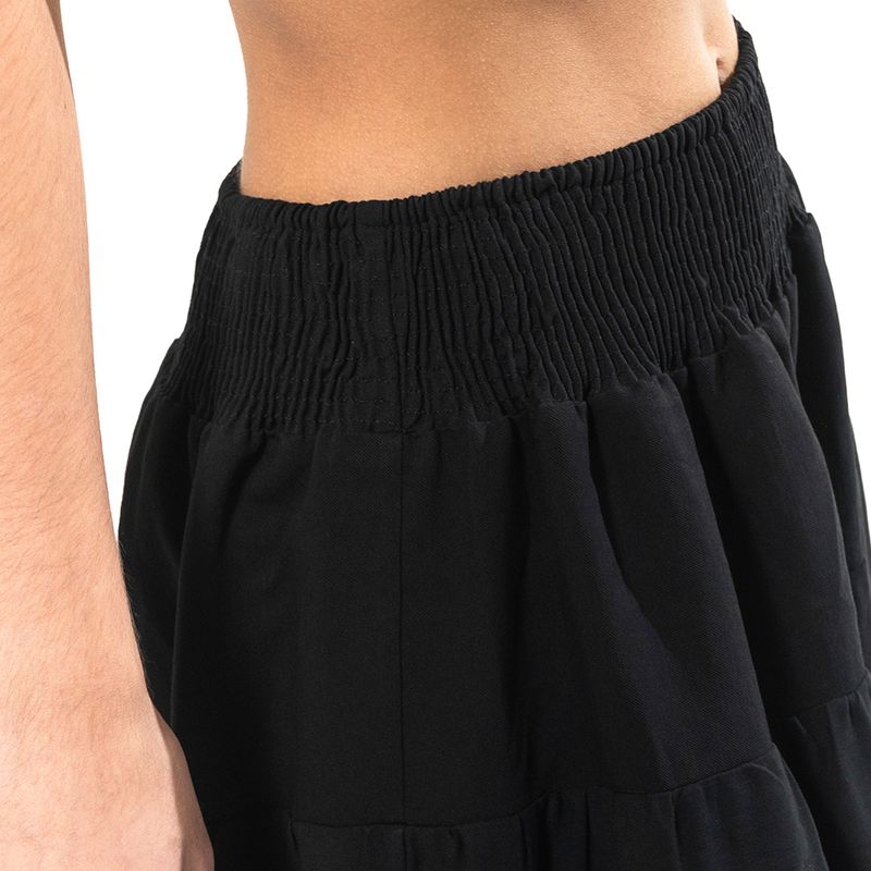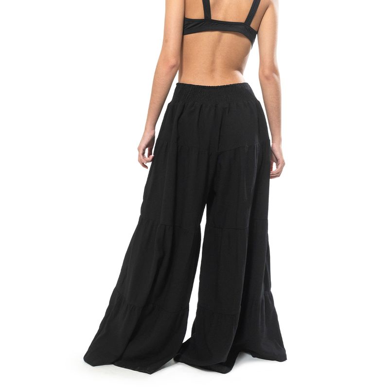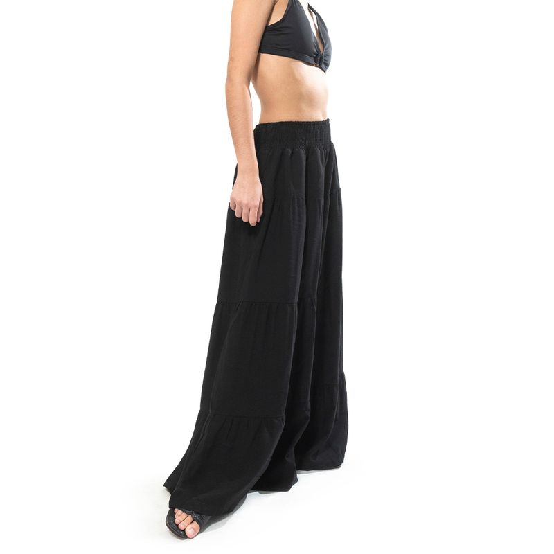 Pantalón de corte amplio en color negro, diseñado con una cintura elástica que asegura comodidad y un ajuste flexible. Confeccionado en un tejido ligero, su diseño fluido y con capas añade movimiento y estilo. Ideal para combinar con tops básicos o piezas estampadas, creando un look relajado y versátil.