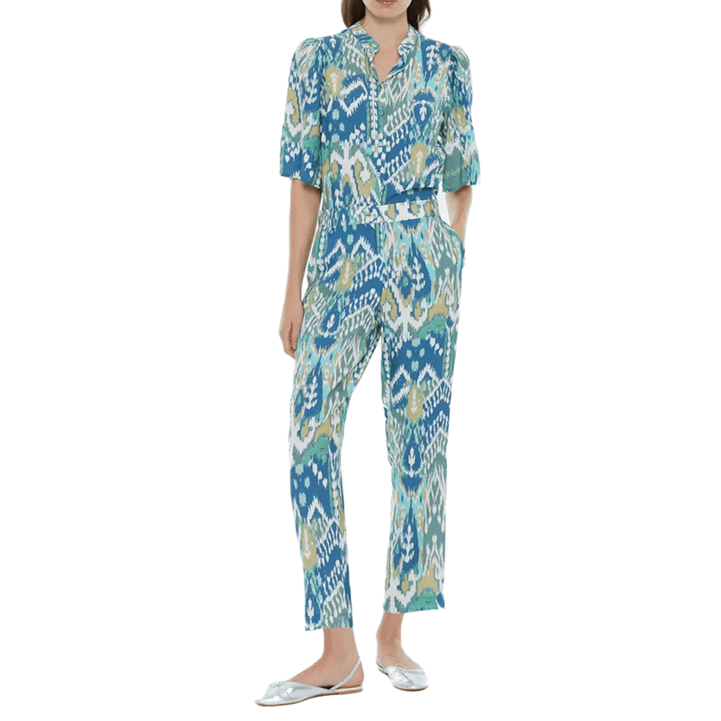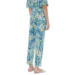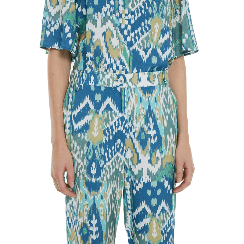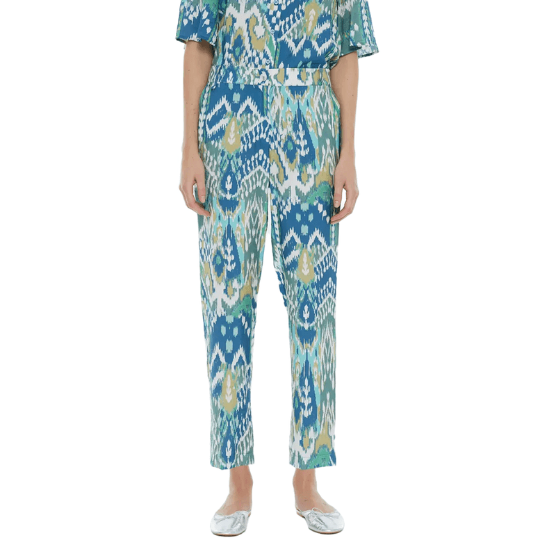 Pantalón recto de mujer tobillero estampado, goma elástica en cintura trasero. Cierre con botón y cremallera. Bolsillos laterales.
