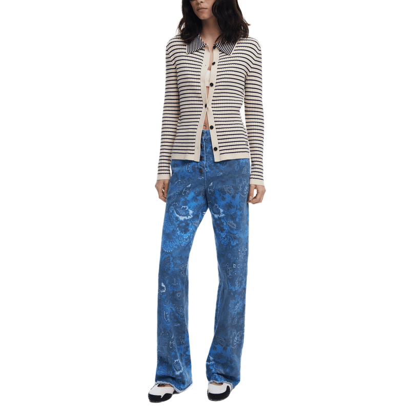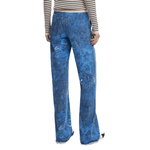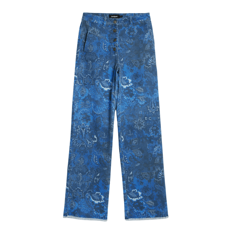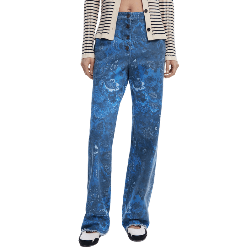 Pantalón largo con detalle de puntada en V en la cintura, cierre de botones, bajo deshilachado y estampado paisley en tonos azules.
