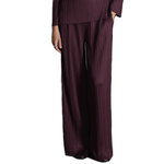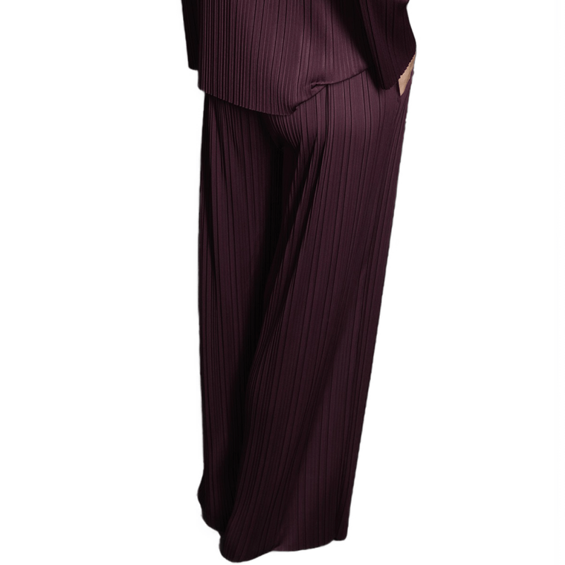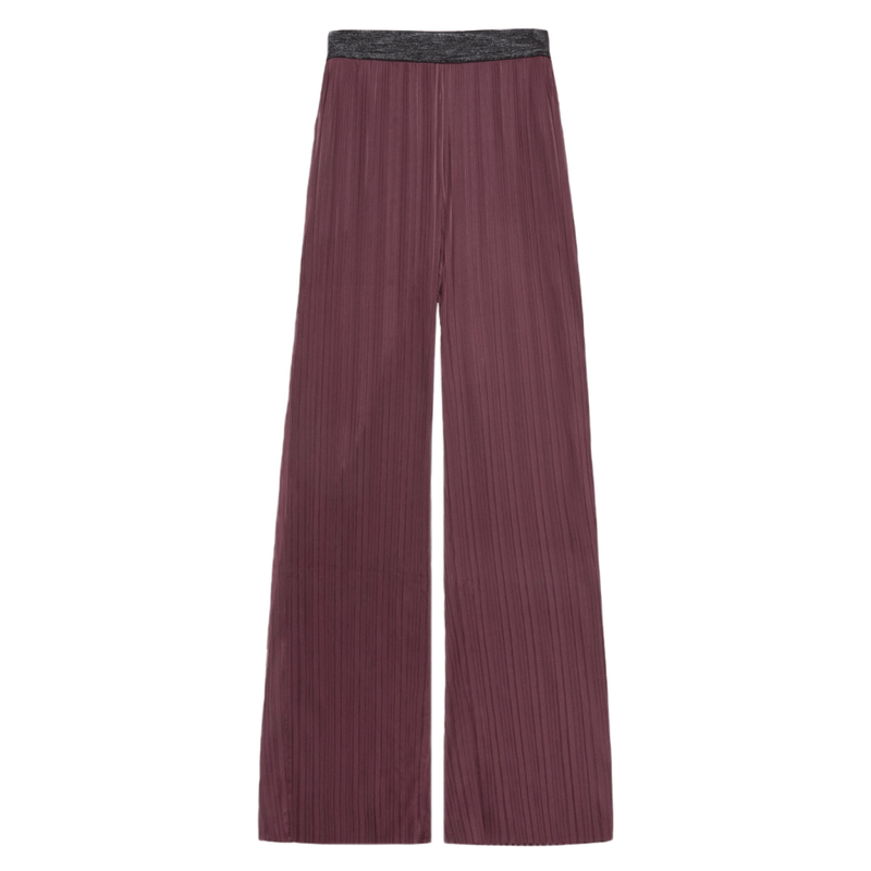 Pantalones plisados en tono aubergine con diseño ancho y fluido. Una prenda con carácter que aporta distinción y elegancia al look.