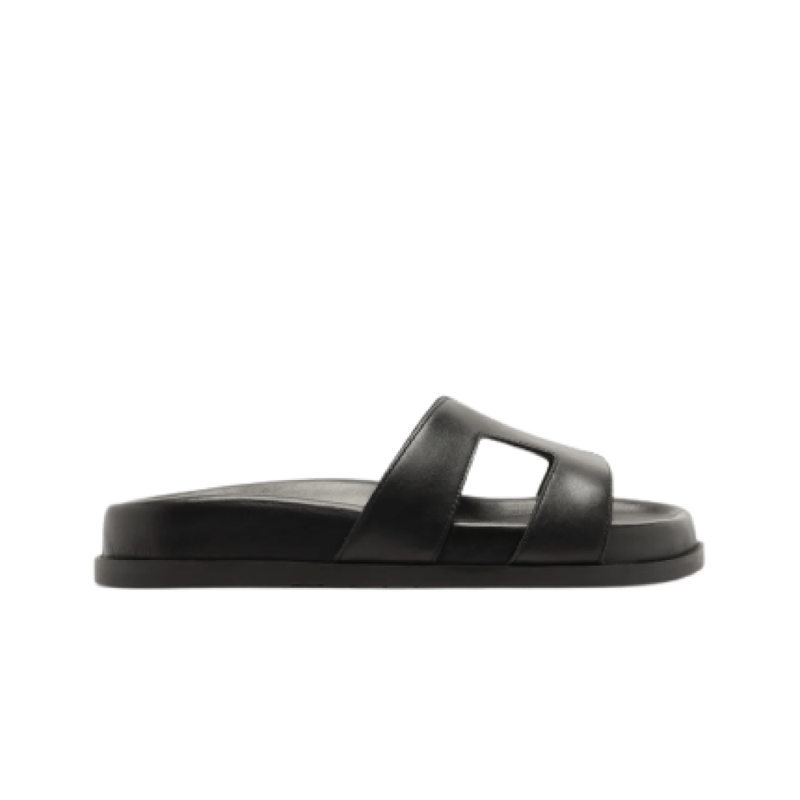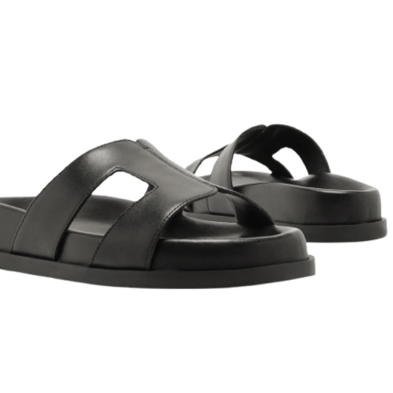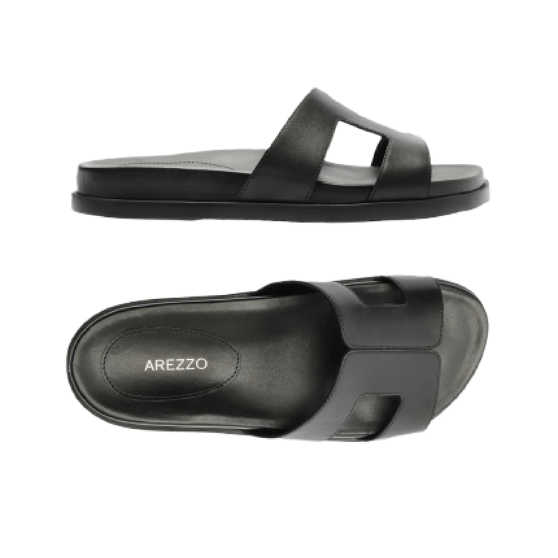 Sandalia rasteira femenina Arezzo en color negro, confeccionada en cuero, con capellada de recortes en forma de H que aportan un diseño moderno y elegante. Cómoda y ligera, es ideal para el uso diario, paseos o looks casuales con un toque sofisticado.