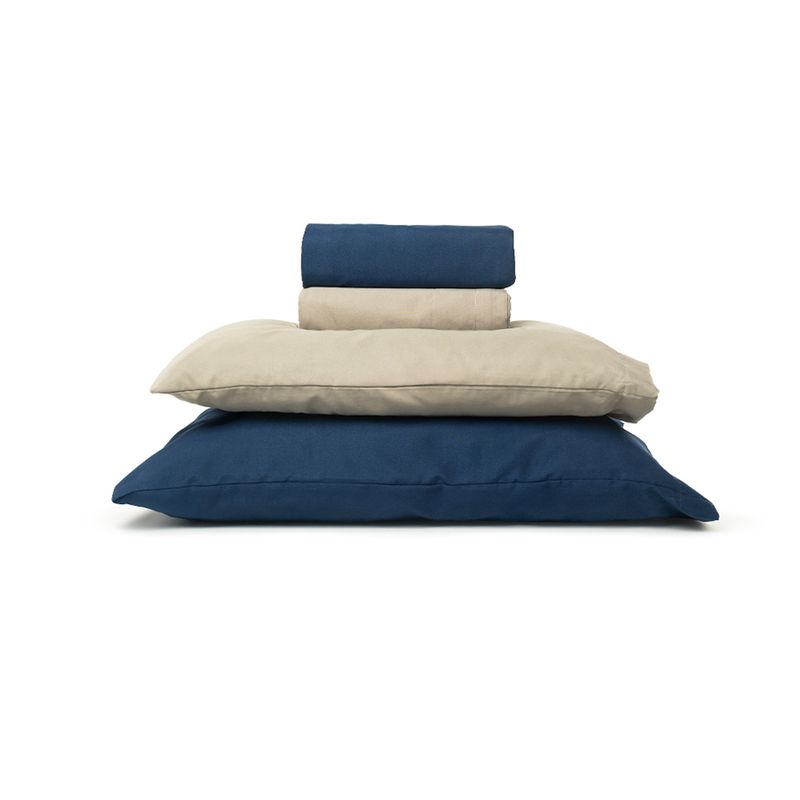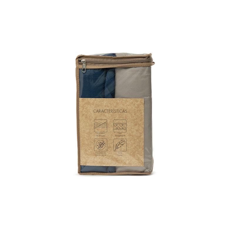 Set de sábanas Italica de microfibra, diseñado para brindar una experiencia de descanso cómoda y funcional. Su tejido suave y ligero permite un secado rápido y fácil cuidado. Los tonos azul navy y taupe aportan un estilo elegante y contemporáneo al dormitorio.