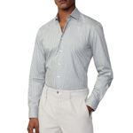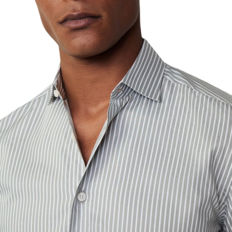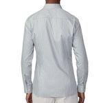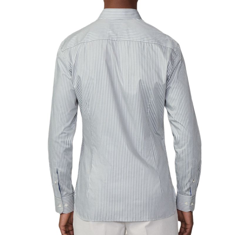 Camisa de sarga de algodón con un diseño de ajuste entallado. Presenta un cuello Kent cutaway, mangas largas con puños abotonados y un estampado de rayas verticales en toda la prenda. Incluye una abertura frontal, tejido en contraste en el interior del puño y una pieza trasera para un acabado impecable.
