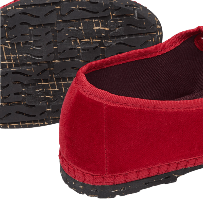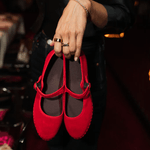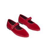 Zapatos Mellark Mary Jane roja de terciopelo con hebilla delicada. Un diseño clásico que destaca en cualquier look.