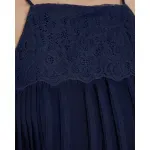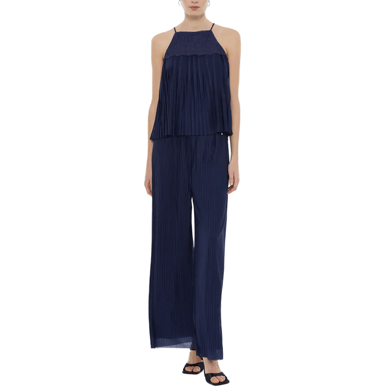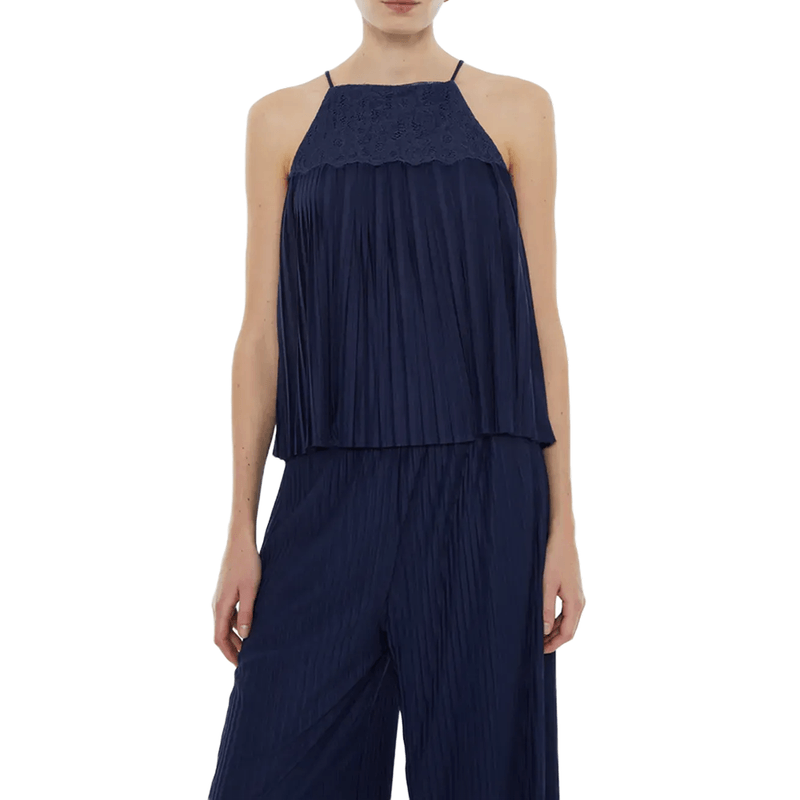 Top de mujer plisado de tirante fino, cuello tipo halter. Detalle de encaje a tono en la parte frontal. Regular fit. Puedes encontrar su pantalón a conjunto.