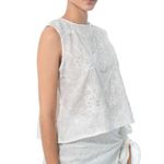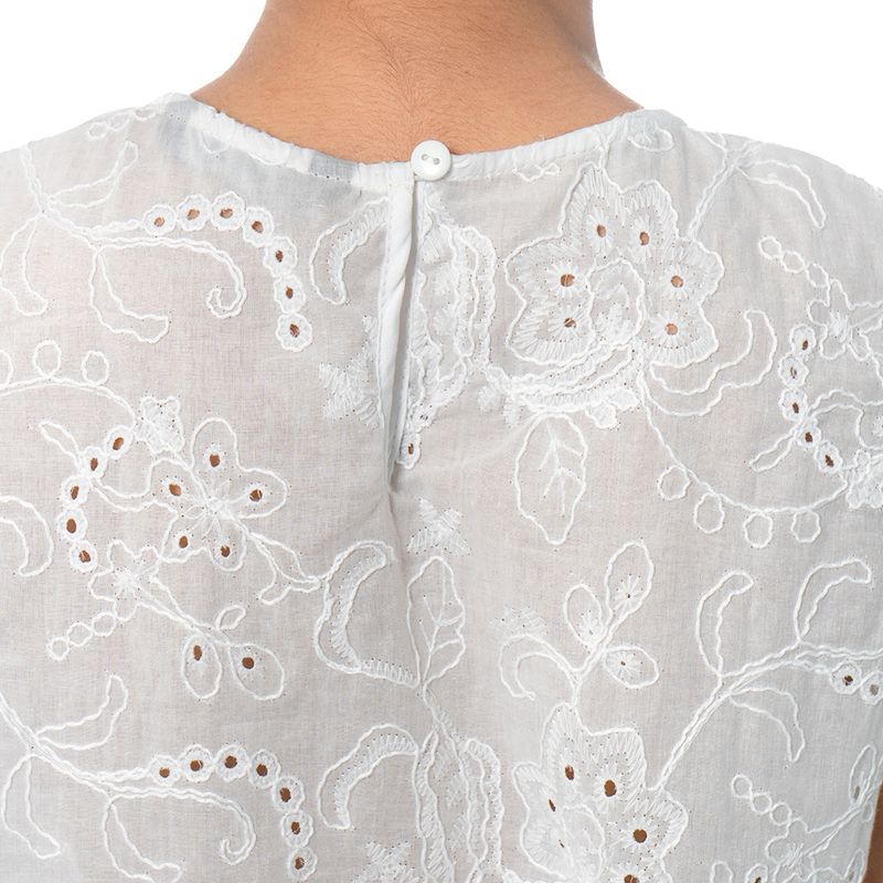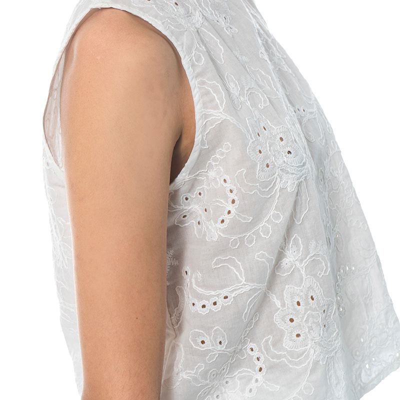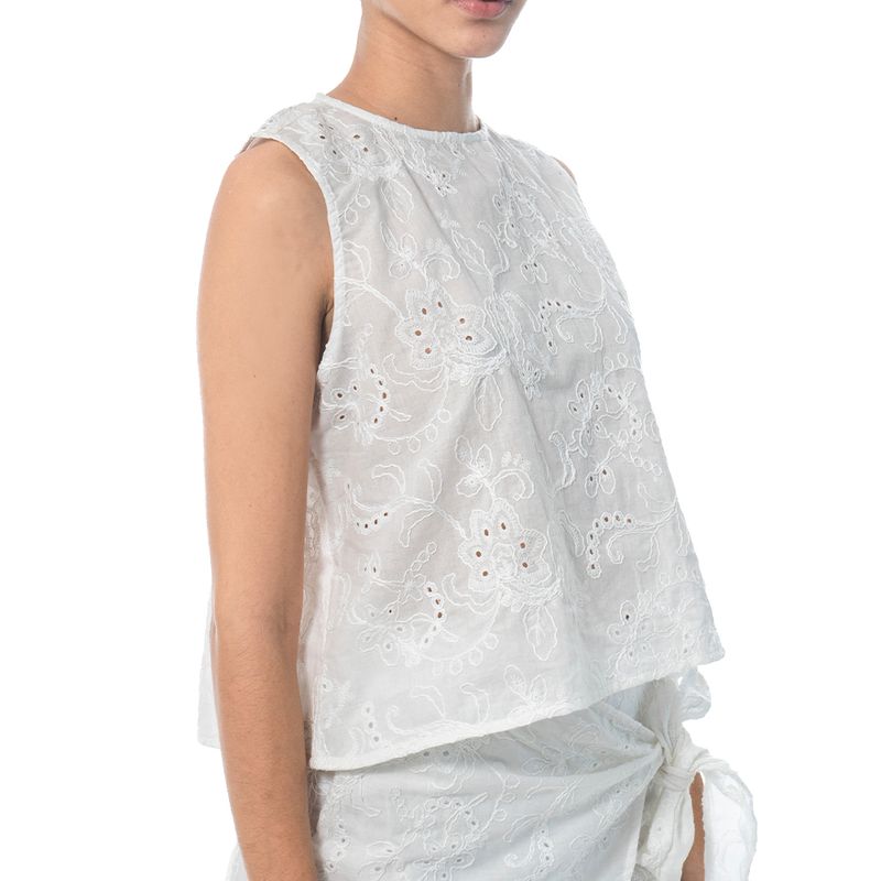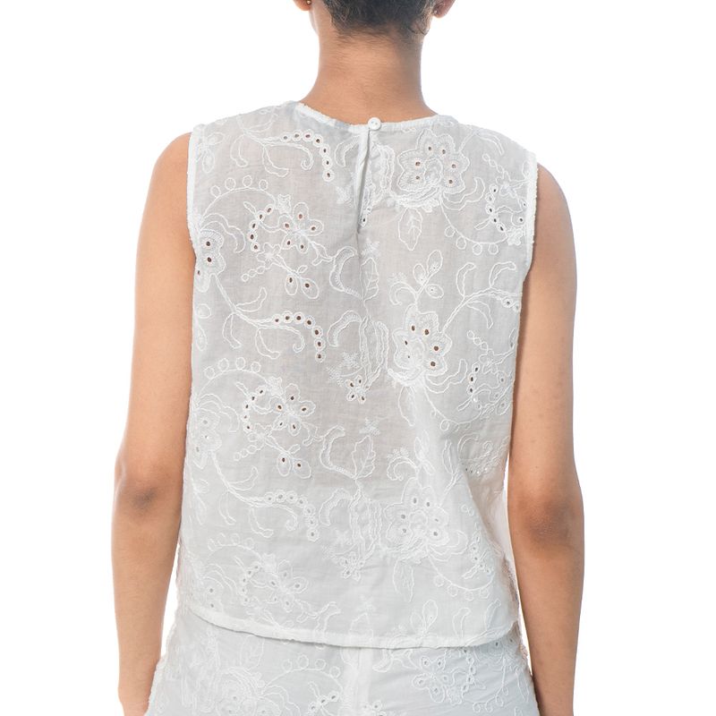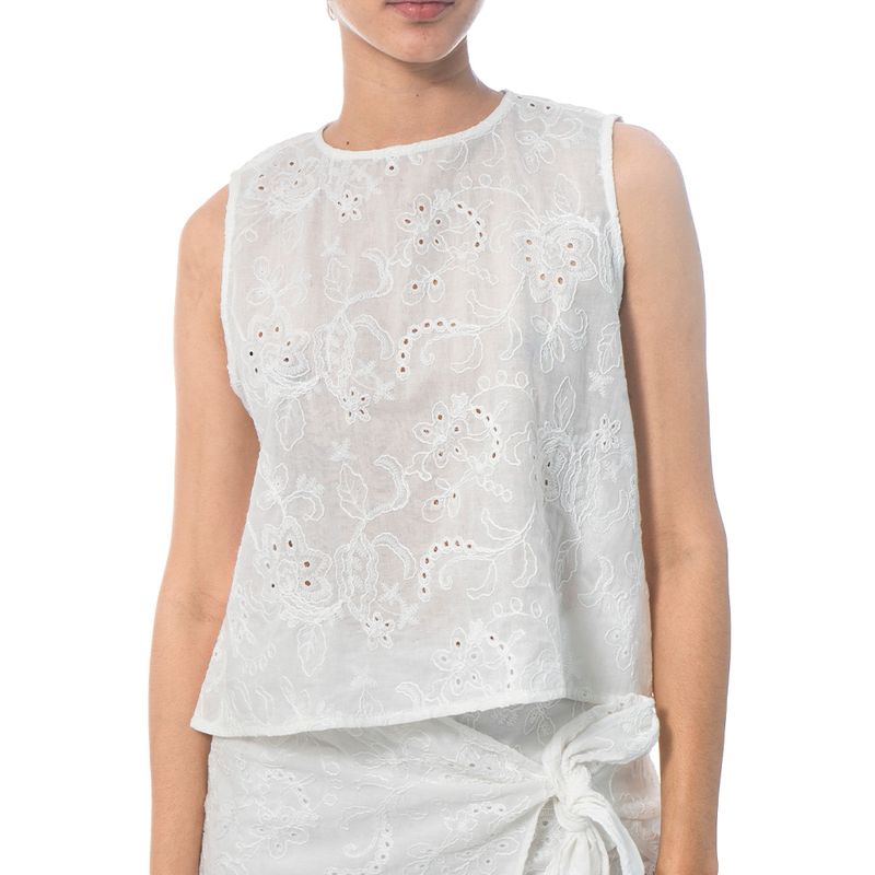 Blusa sin mangas en color blanco, confeccionada en tela bordada con motivos florales y detalles de ojales que aportan textura y delicadeza. Su diseño de corte recto y cuello redondo la hace versátil y fresca, ideal para combinar con faldas, shorts o pantalones para un look ligero y femenino.