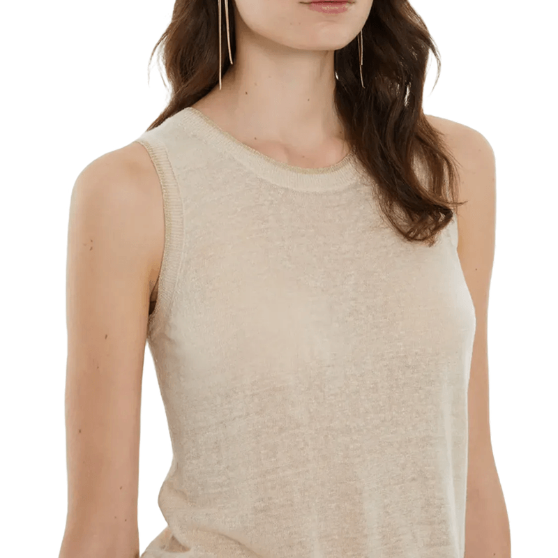 Jersey de punto fino en lino y algodón de escote redondo y sin mangas. Ribete con hilo metalizado oro en escote y contorno sisas. Regular fit.