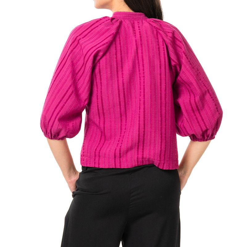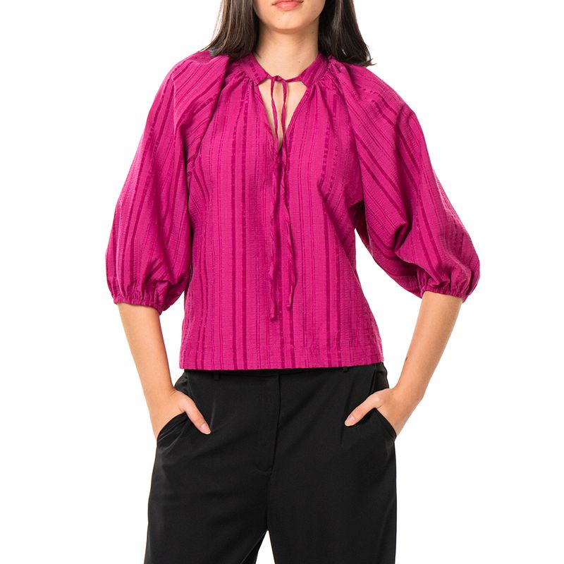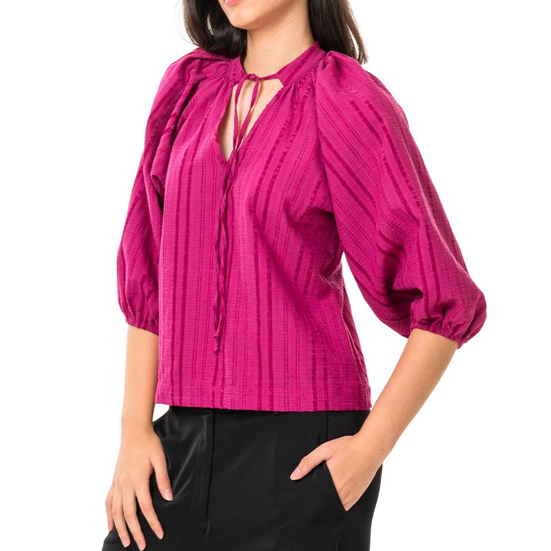 Top de silueta estructurada con volumen protagonista que aporta un look moderno y femenino. Ideal para elevar outfits casuales o de noche.