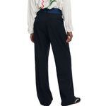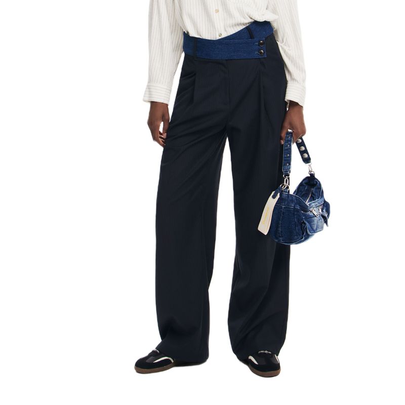 Pantalón largo entallado con patrón de rayas, tiro medio y pierna recta. Presenta una cinturilla vaquera, dos bolsillos funcionales y cierre de botón con zip. Confeccionado en poliéster reciclado, combina estilo clásico y sostenible.