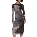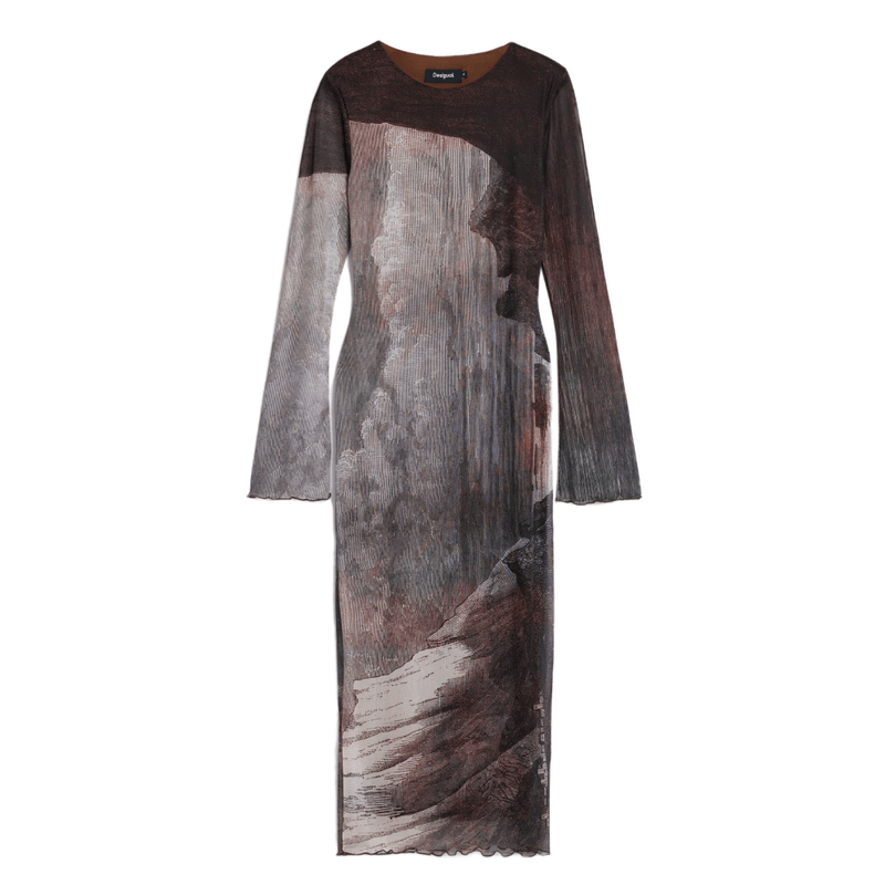 Vestido midi con mangas largas acampanadas, cuello redondo, terminaciones en canalé y estampado de paisaje diseñado por Monsieur Christian Lacroix.