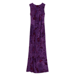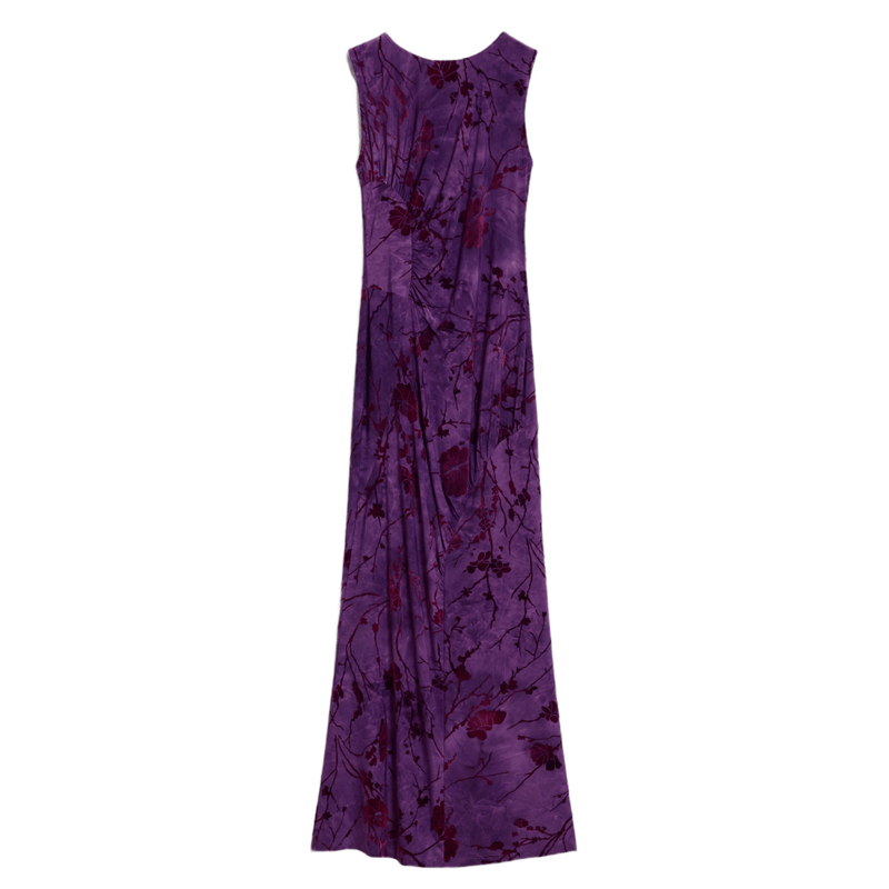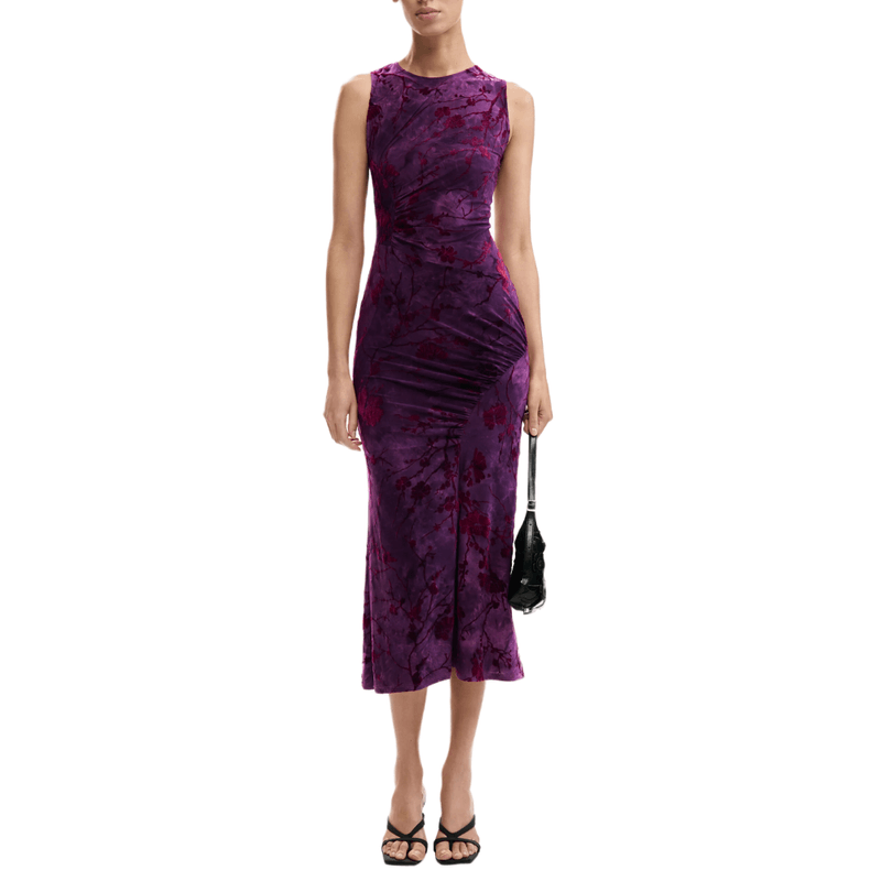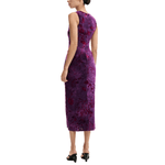 Vestido midi de cuello redondo, sin mangas y drapeado delantero asimétrico con estampado floral oriental en tonos morados.