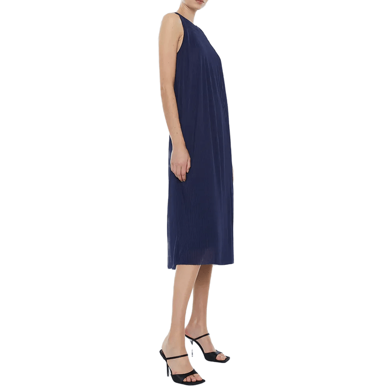 Vestido midi plisado de punto, escote redondo y sin mangas. Vestido plisado por la parte delantera y punto liso en espalda. Detalle de puntilla a tono en escote hasta altura sobre pecho. Forrado en punto. Regular fit.