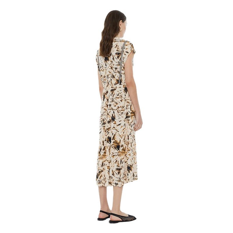 Vestido midi estampado de escote pico y cuello mao, sin mangas. Detalle de una cinta tipo étnica en contorno escote, delantero y espalda. Goma elástica en cintura espalda y volante ancho en el bajo. Regular fit.