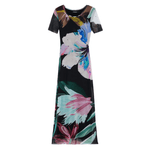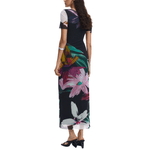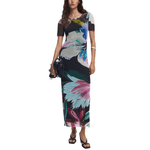 Vestido midi entallado, de manga corta, con cuello redondo y estampado floral acuarela.
