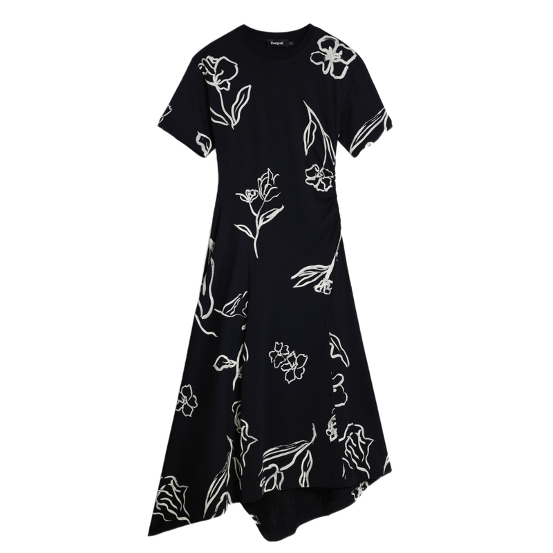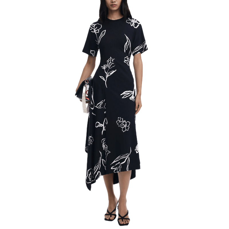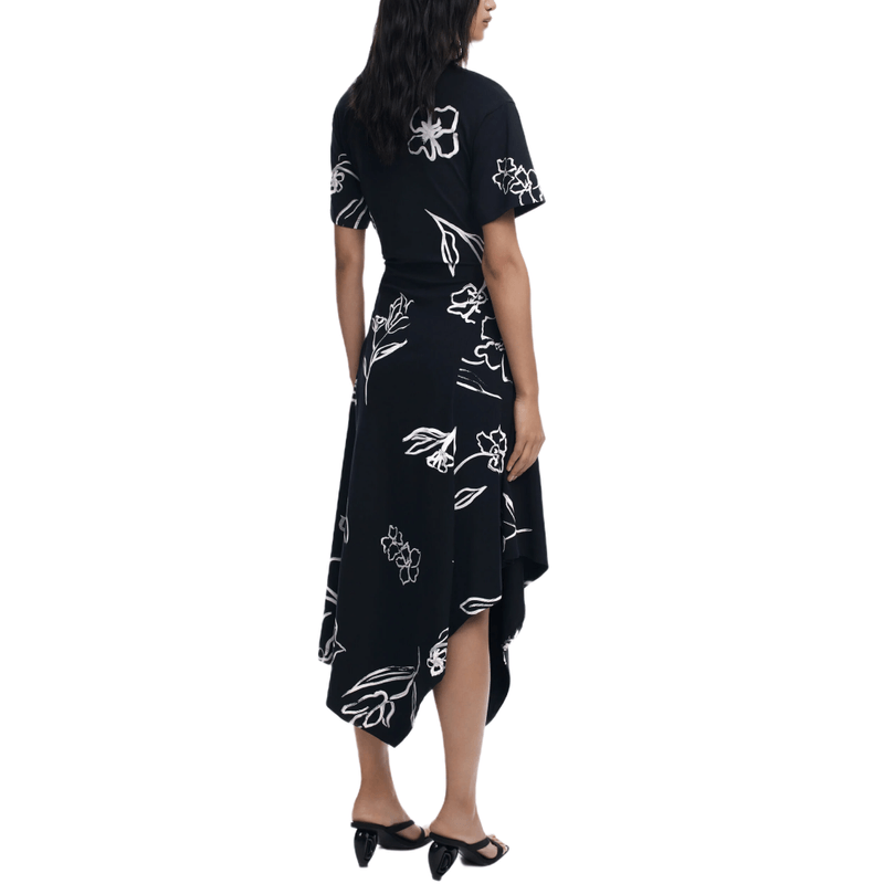 Vestido midi con bajo asimétrico, manga corta tipo mariposa y escote redondo, en color negro con estampado de trazos florales en contraste.