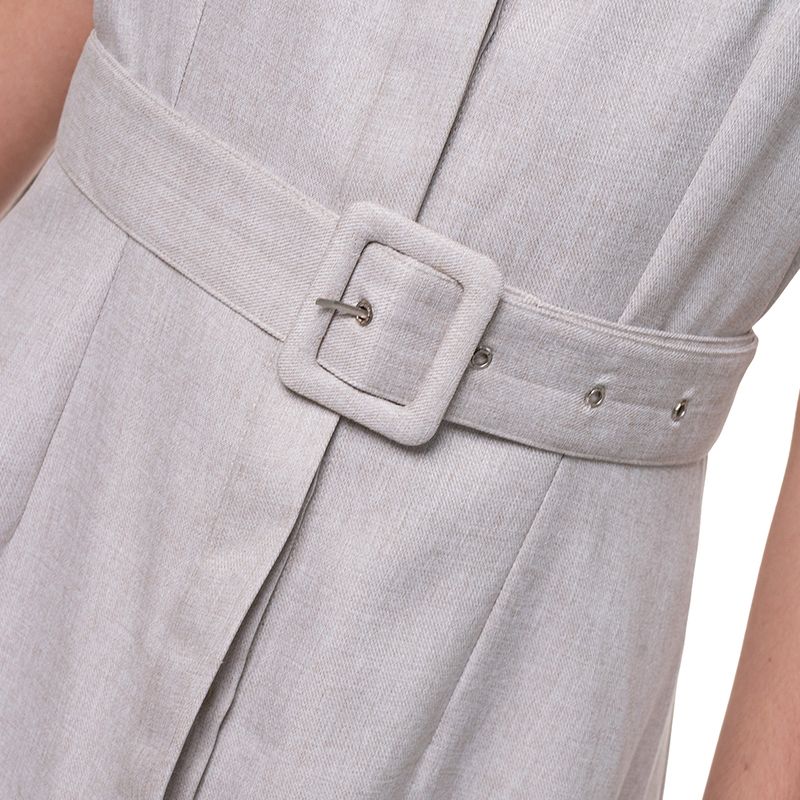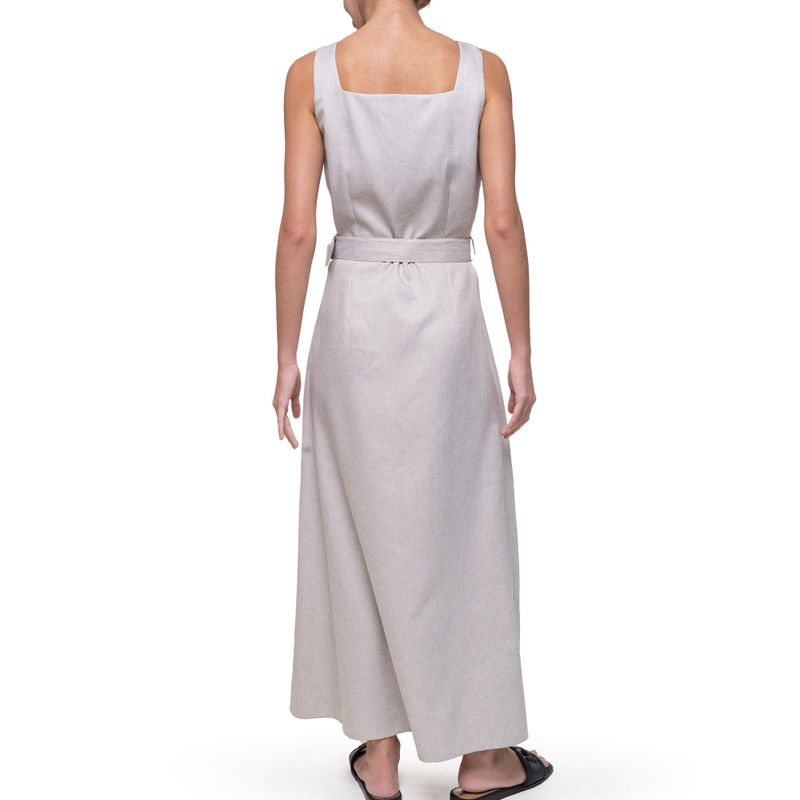 Vestido largo sin mangas con cinturón – Diseño con escote cuadrado y tirantes anchos. – Cinturón del mismo tono con hebilla forrada. – Corte recto con caída fluida hasta los tobillos. – Cierre frontal con botones ocultos. – Tela ligera de textura suave.