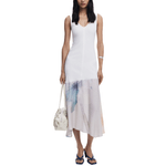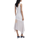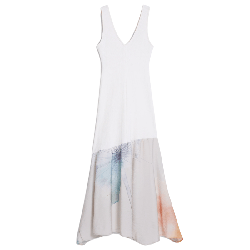 Vestido corto con falda combinada, escote en pico sin mangas en color liso y bajo asimétrico con estampado floral acuarela.
