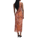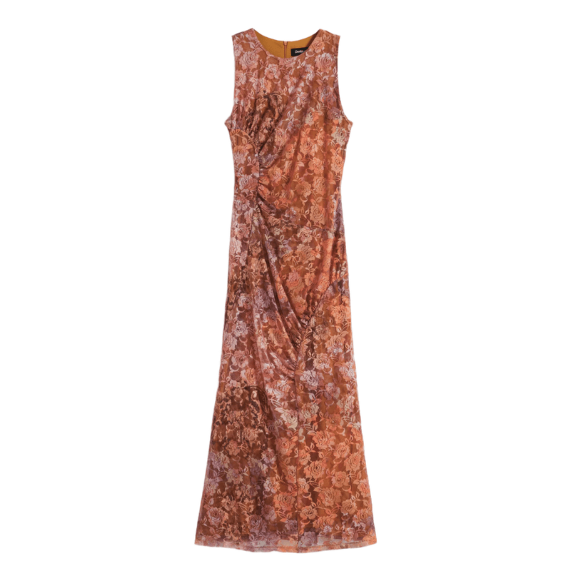 Vestido midi ajustado, sin mangas, con escote redondo, fruncido irregular en la parte delantera y estampado floral inspirado en papel pintado.