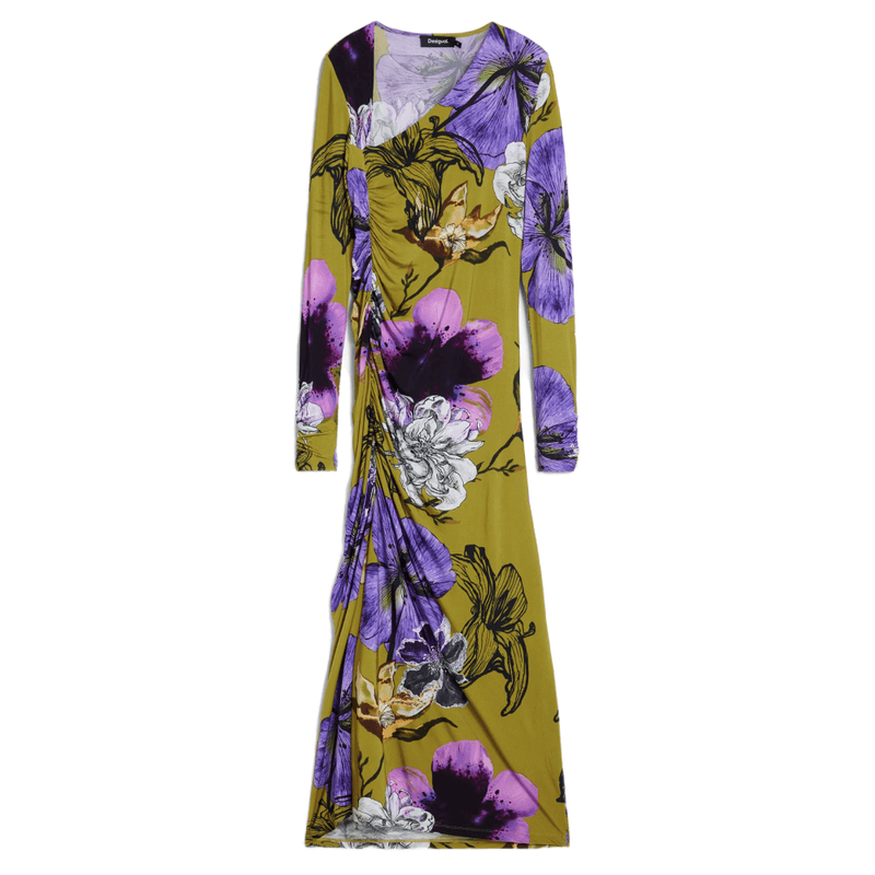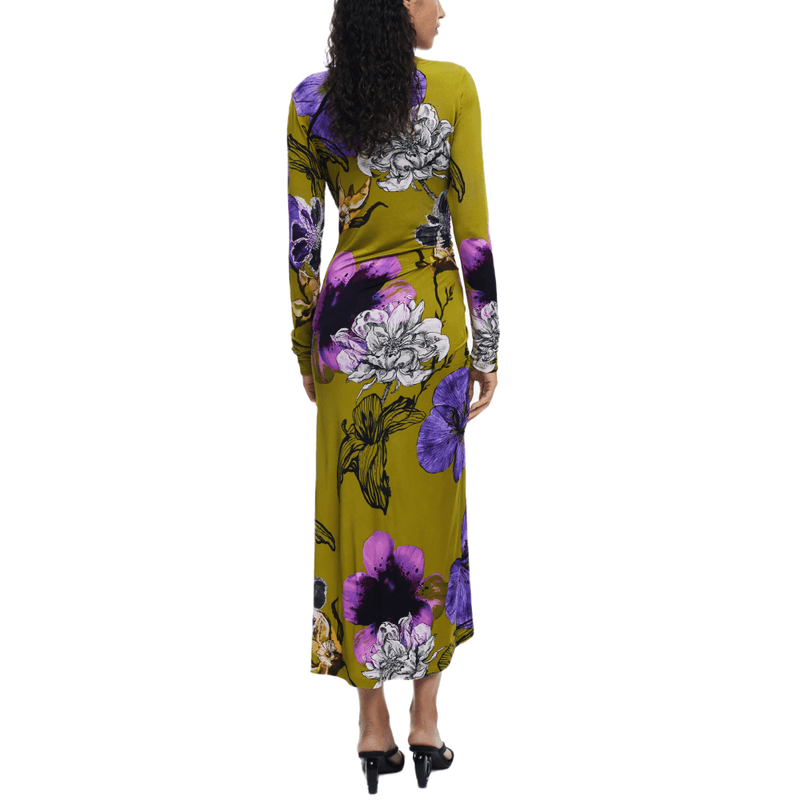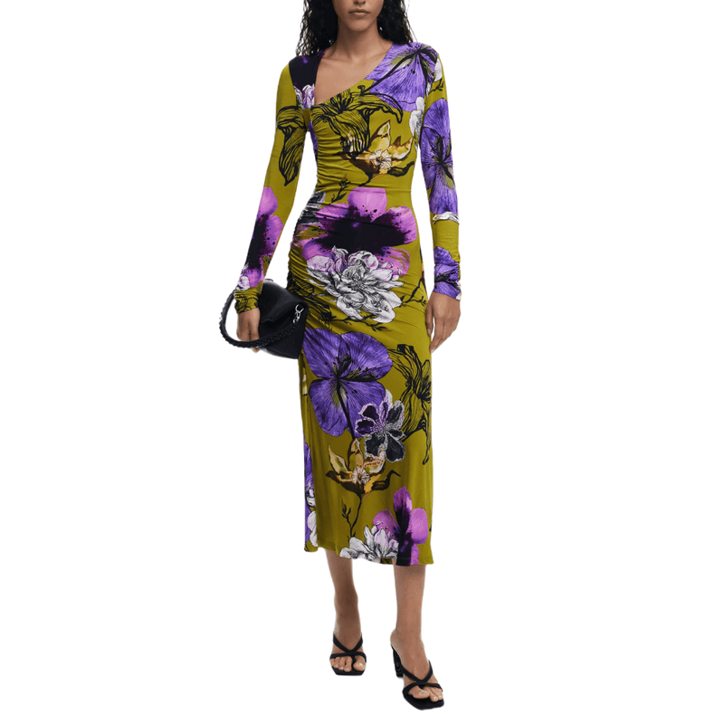 Vestido midi, manga larga, escote asimétrico, fruncido delantero y falda evasé con estampado floral diseñado por Monsieur Christian Lacroix.