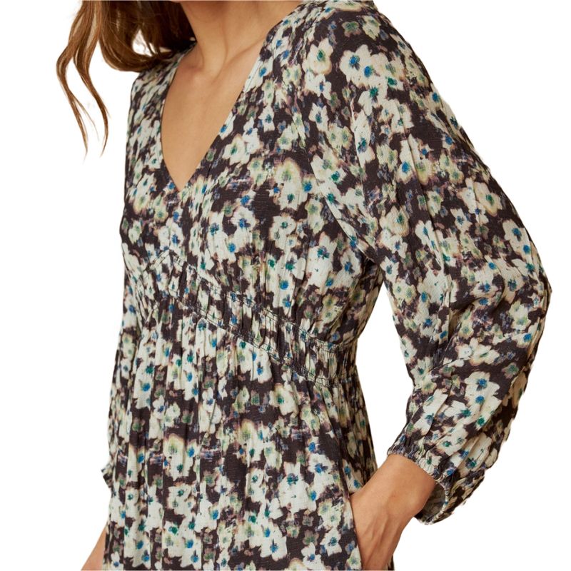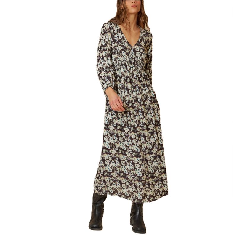 Este vestido está compuesto de viscosa, por lo que tiene mucho movimiento y es ligero. El corte imperio se ajusta debajo del pecho y cae fluido por la falda.Tiene una silueta femenina con toque romántico.