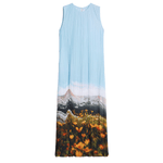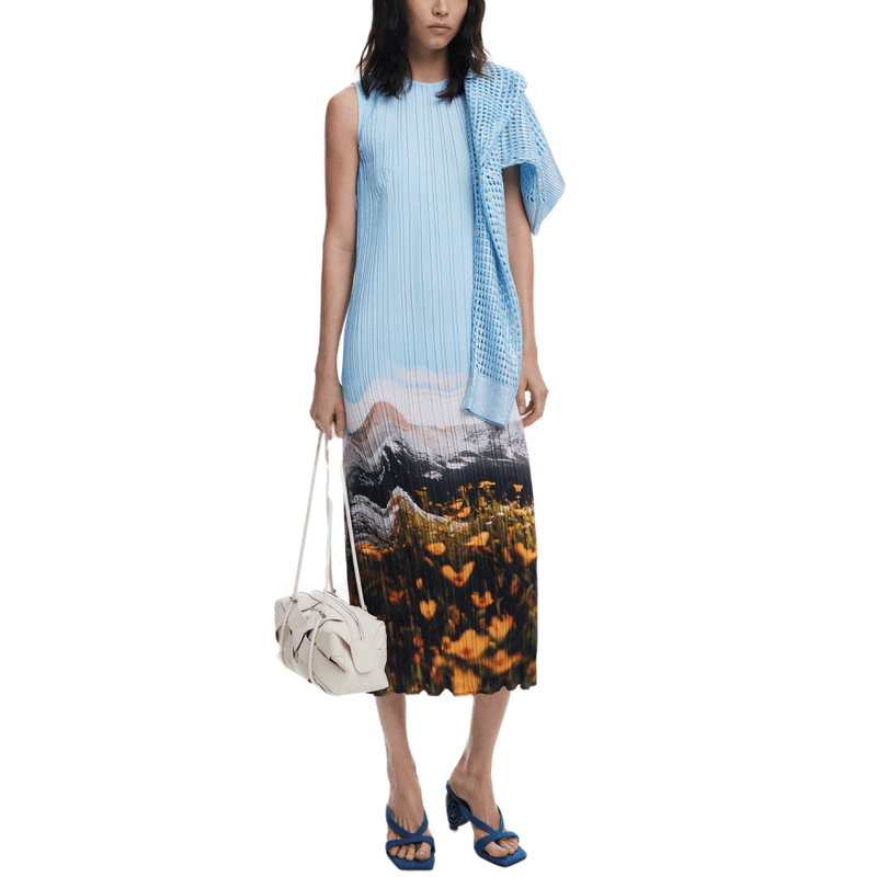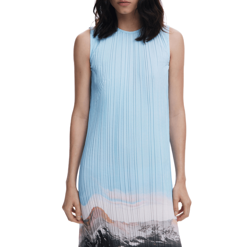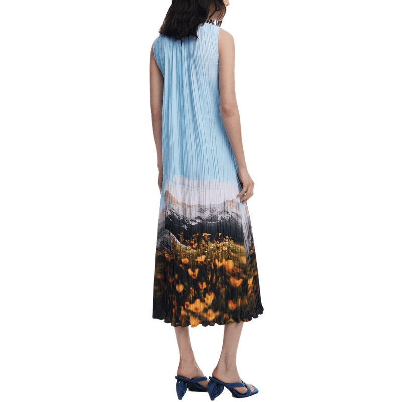Vestido midi fluido sin mangas, cuello redondo, tejido plisado y estampado de paisajes.