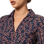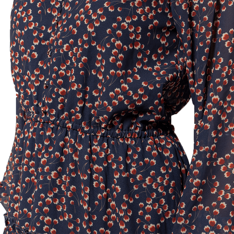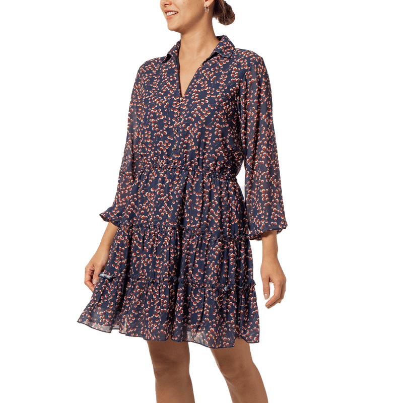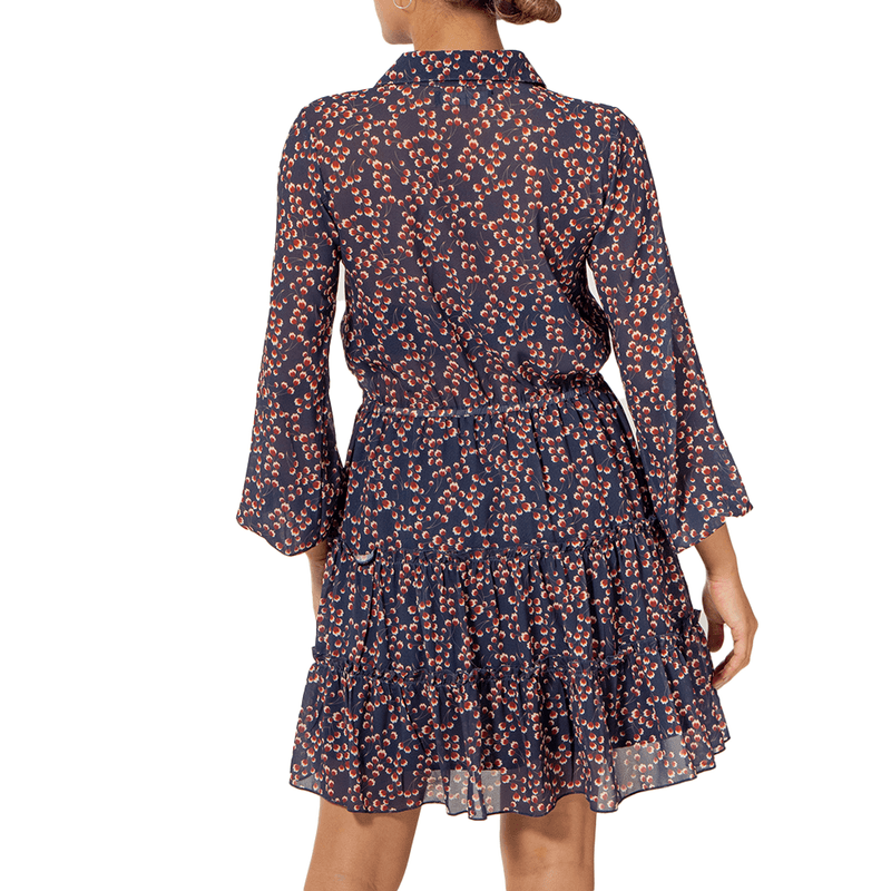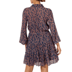 Vestido confeccionado en chiffon estampado, con cuello camisero que se complementa con un elegante escote en V. Las mangas bishop añaden un toque de gracia, mientras que el detalle de corte en la cintura con elástico proporciona un ajuste cómodo y favorecedor. La falda en A completa la pieza con una silueta fluida