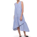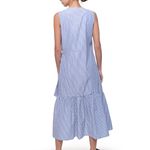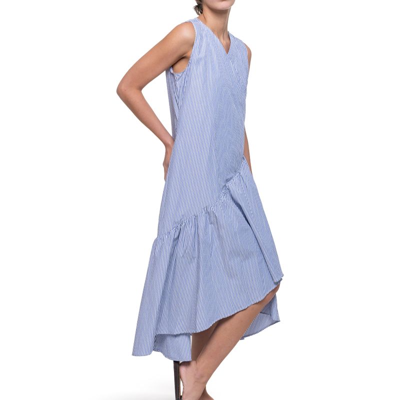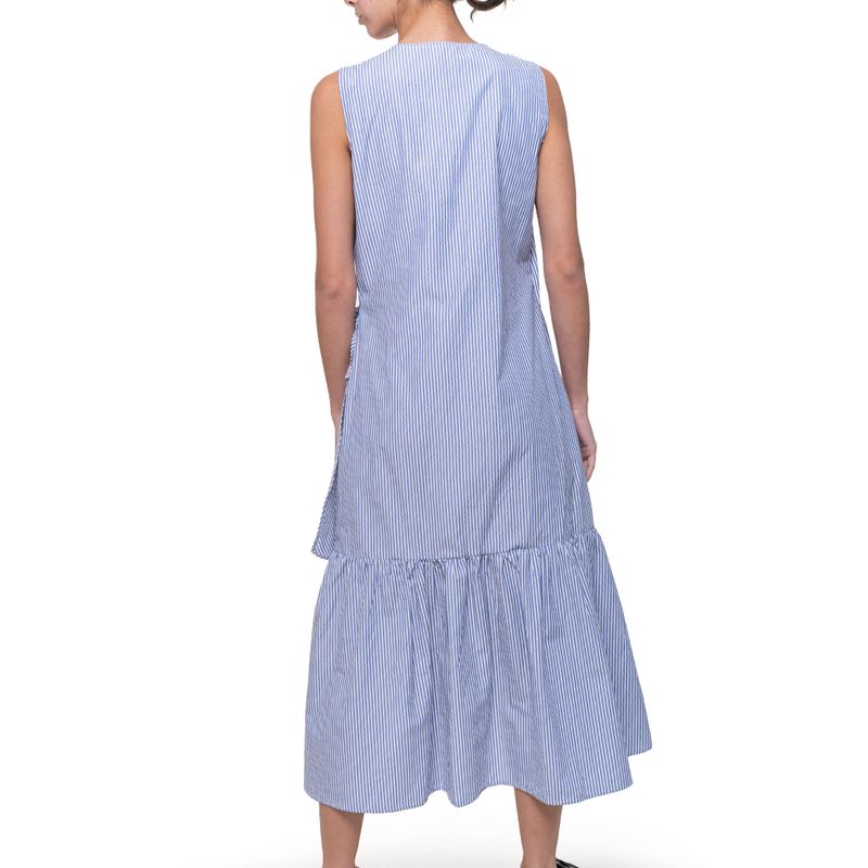 Vestido largo sin mangas a rayas – Diseño asimétrico con falda de volantes. – Escote en V y silueta amplia. – Tela ligera con estampado de rayas verticales. – Largo midi con bajo más largo en la parte posterior. – Ideal para looks frescos y relajados.