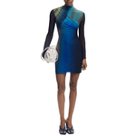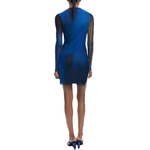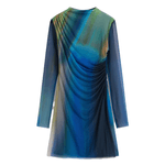 Vestido corto de tul con manga larga, cuello ligeramente subido, drapeado delantero y colores degradados en tonos azules.